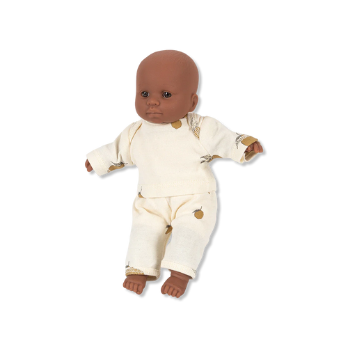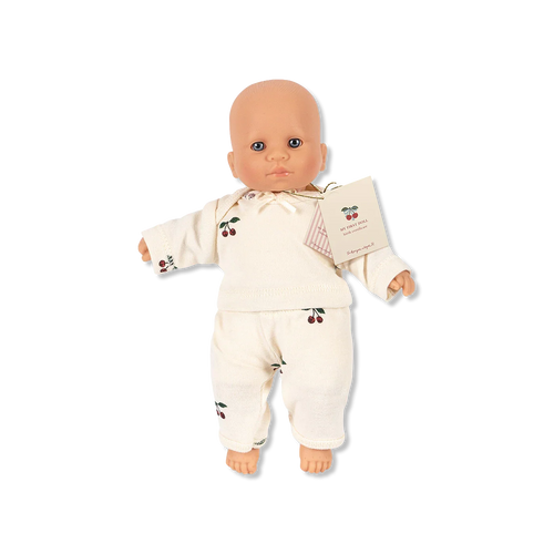Schöne Vinylpuppe mit Kleidung im beliebten Kirschprint aus 100 % Bio-Baumwolle. Die Kleidung lässt sich vom Kind leicht an- und ausziehen.