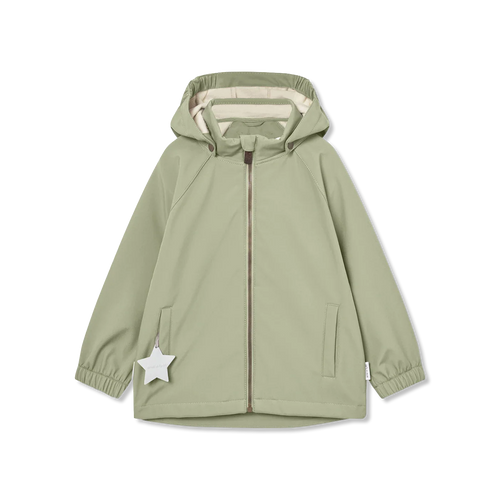 Praktische Softshelljacke von Mini A Ture, bestehend aus drei Lagen: Obermaterial, Membran und weichem Fleecefutter. Der charakteristische Sternreflektor befindet sich in der Vordertasche, ein reflektierendes Logo ist auf der Rückseite angebracht.
