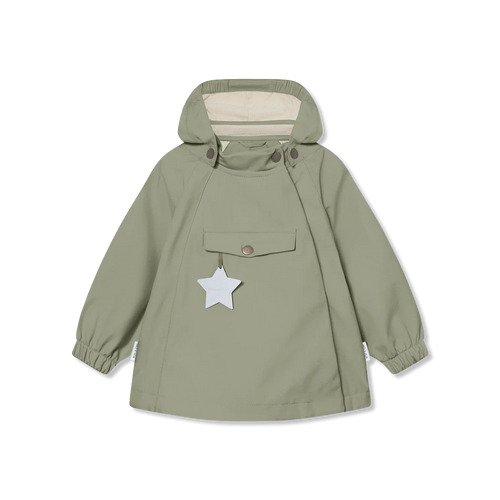Praktische Softshelljacke von Mini A Ture, bestehend aus drei Lagen: Obermaterial, Membran und weichem Fleecefutter. Die Jacke hat einen verstellbaren Taillenbund. Der charakteristische Sternreflektor befindet sich in der Vordertasche, und ein reflektierendes Logo ist auf der Rückseite angebracht.